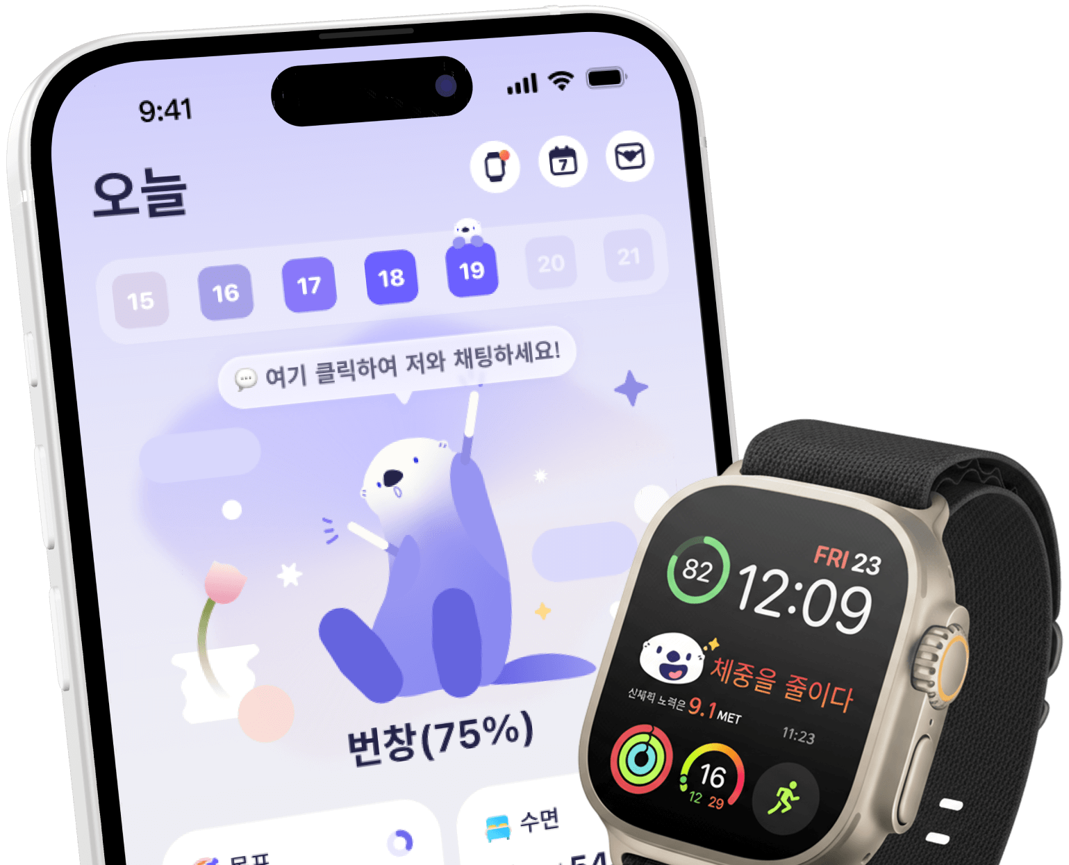 OtterLife는 수면, 운동, 스트레스(HRV), 생리, 물 섭취 등 여러 건강 데이터를 자동으로 추적합니다. 목표를 달성할 때마다 귀여운 수달이 레벨업하고 새로운 꾸미기가 열리기 때문에, 게임하듯이 가볍게 건강 관리를 이어갈 수 있습니다.